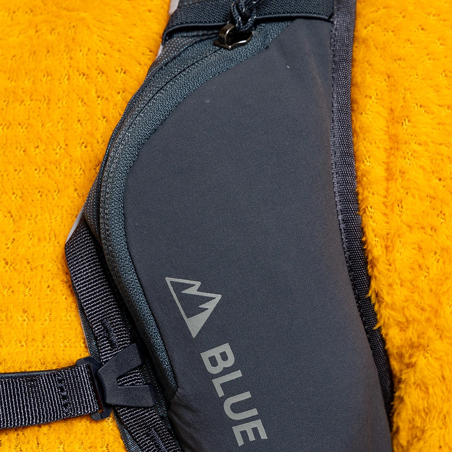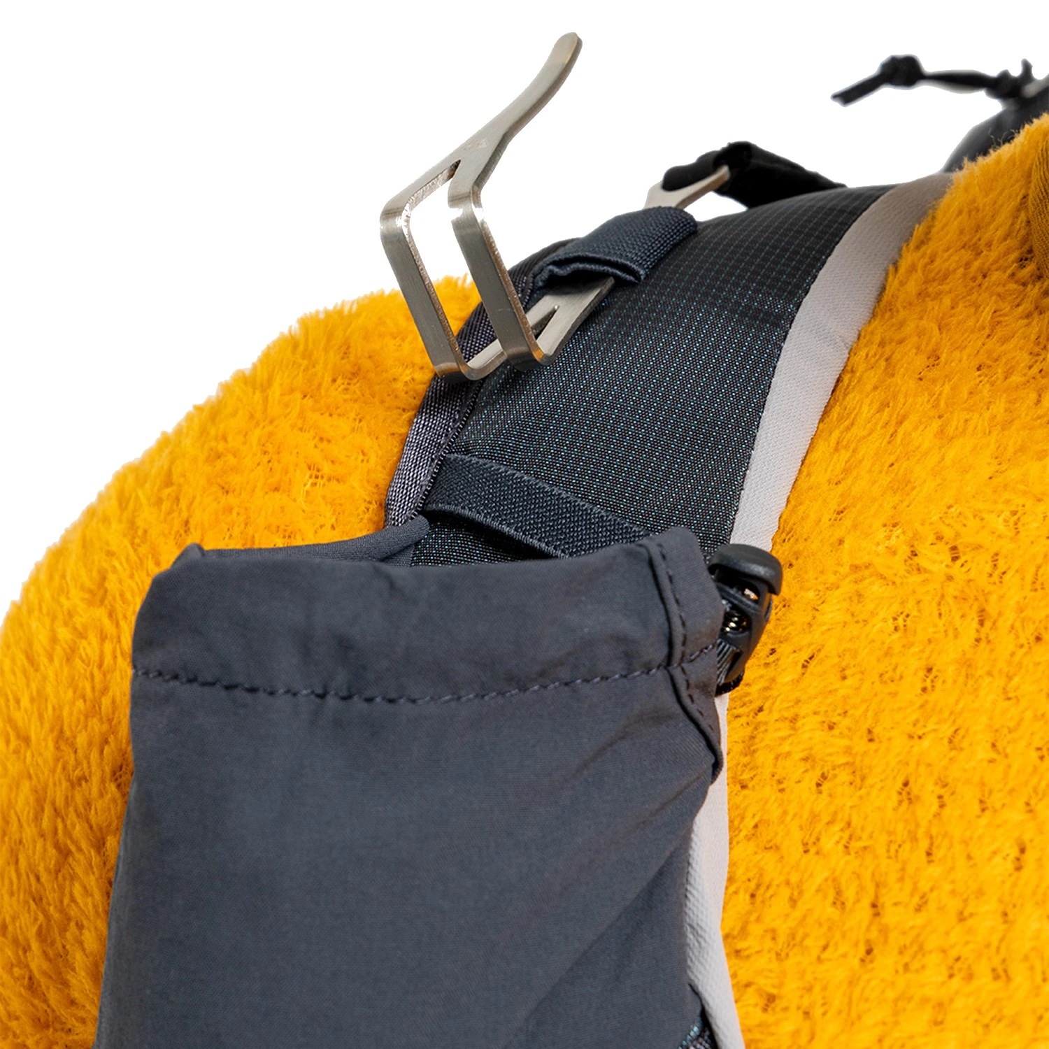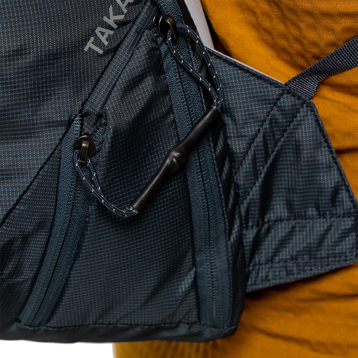 The Taka’s features allow you to access all of the main essentials whilst keeping the pack on. The optimised organisation allows for a smooth transition from skis to mountaineering equipment, while a quick ski carry system integrated with a steel hook and elastic bungee allows you to stow skis whilst on the move. A harness system more akin to a running vest improves comfort, it further allows for the storage and access of water bottles with a zippered pouch for valuables.