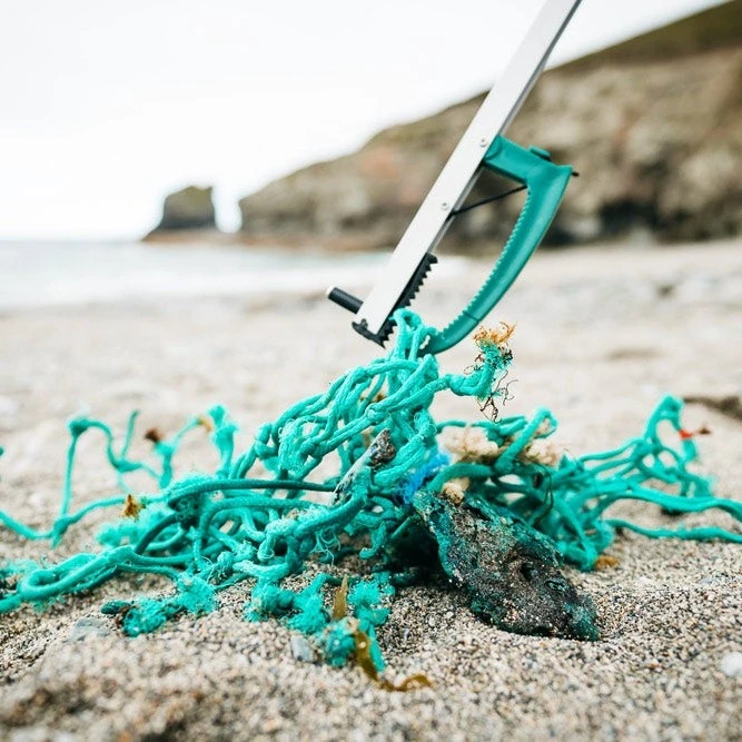 The Ghost Net Litter Picker is made using 100% recycled plastic from trawl fishing nets for the handle, trigger, and jaw components. The shaft is made from durable recycled aluminium. The recycled components are 100% recycled fishing nets that were recovered and collected by hand directly from the coastline.