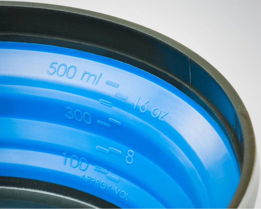 The durable nylon and silicone construction features molded-in graduations for easy measuring and a sturdy nylon rim and base to help prevent sloshing and spills.