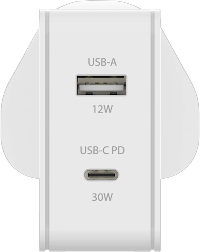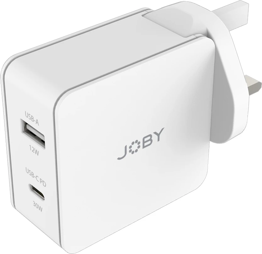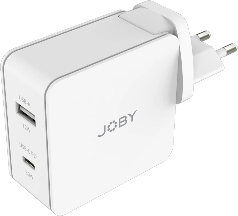 The Joby Wall Charger is a compact wall charger that can be used to fast charge your USB C & USB A powered devices. It features a 30W USB-C PD and 12W USB-A port designed so you can charge your phone and laptop simultaneously.