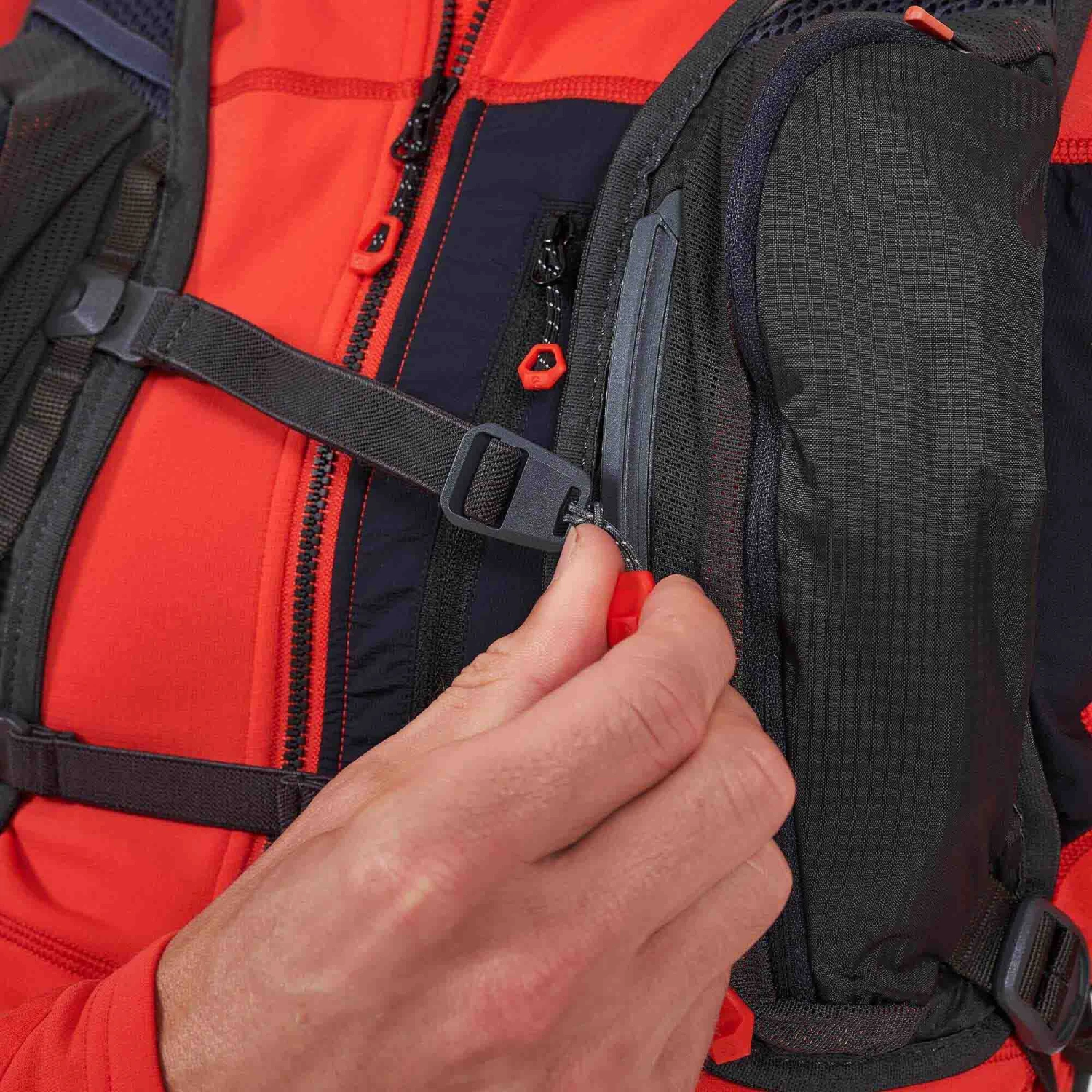 This pack has plenty of storage options with two security zipped pockets on the harness, wrap-around security zip wand pockets, and multiple pole attachment points alongside the main compartment. A fast-access bladder pocket ensures easy hydration too, and reflective details on the front daisy chain ensure you can travel safely even in the dark.