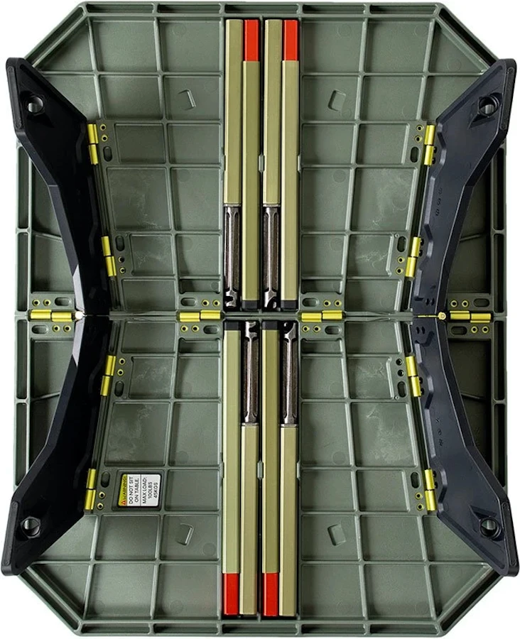 The extremely smooth and durable table surface is easy to clean. The hinges and legs are made from tough aluminium with carbon fibre and zinc pole tips providing stability and support on uneven surfaces.