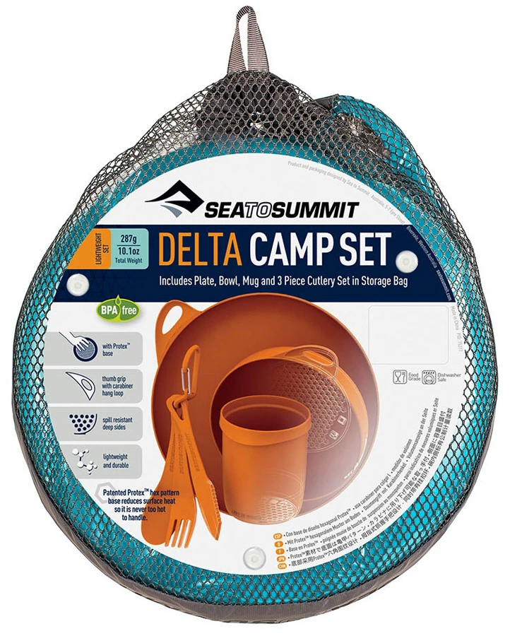 The Sea to Summit DeltaLightâ„¢ Camp Set gives you essential camp dinnerware with plate, bowl, mug and 3-piece cutlery set. This BPA-free, glass-reinforced polypropylene camp set is perfect for any outdoor adventure – from solo outings to Scouting and DofE adventures.