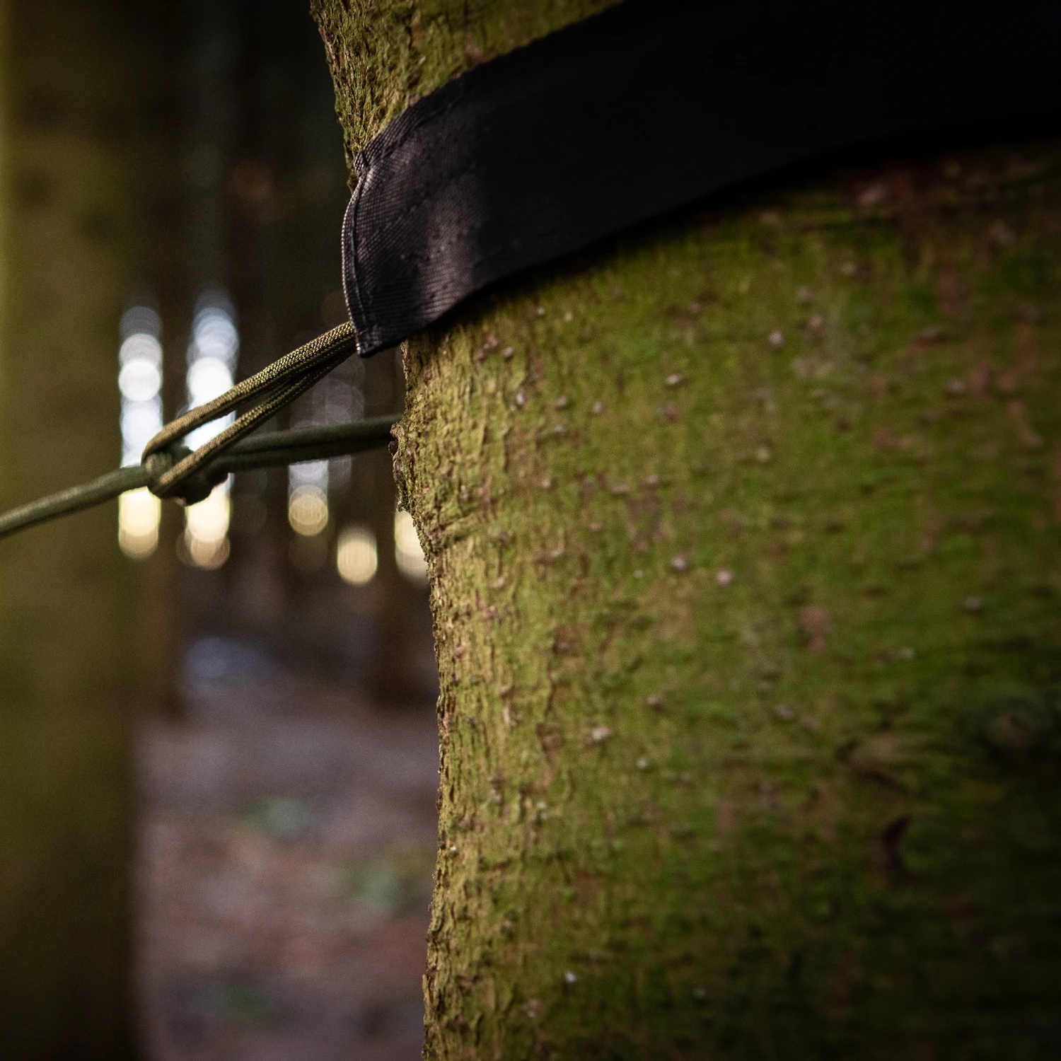 - Suspension Attachment System: Made out of “550” paracord with spaced-out knots to allow for various attachment points and distances from the tree