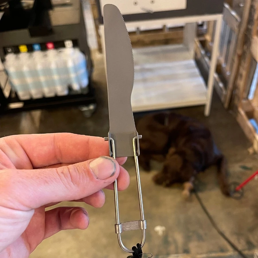 The folding handle is designed to absorb impact, and locks into position by pushing down the sliding block. For easier storage, the sliding block unlocks the folding handle, neatly folding the knife in half. This knife fits in any Toaks pot or cup.