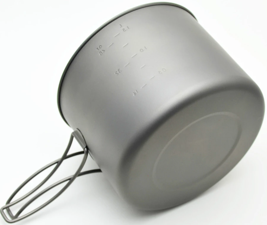 The pot is made of durable, corrosion-resistant titanium and features a lid with travel-friendly folding grips, measuring indicator and storage sack.